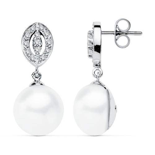 9K PENDIENTES ORO BLANCO PERLA 28X9 MM CIERRE CATALAN