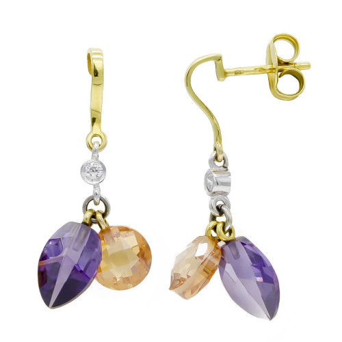 18K PENDIENTES ORO BICOLOR DOS CUERPOS ZAFIRO AZUL 6 X 4 MM Y CIRCONITAS. 22 X 8MM CIERRE CATALAN