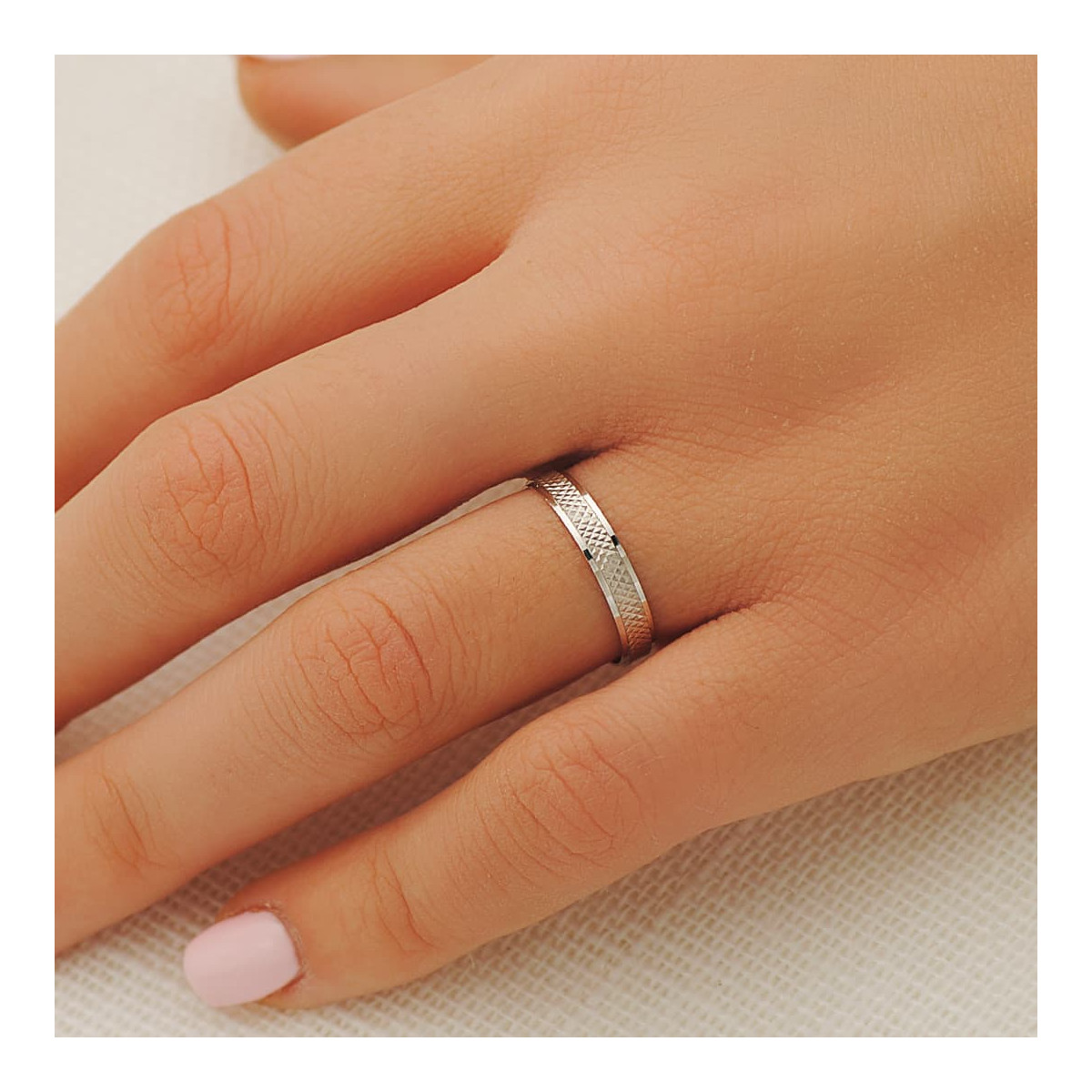 18K ALIANZA ORO BLANCO BORDES BRILLO Y CENTRO TALLADO. ANCHO: 3,5 MM