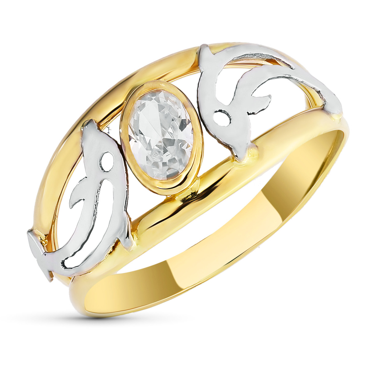 18K SORTIJA ORO BICOLOR DOBLE CUERPO CON DELFINES Y CIRCONITA. ANCHO: 9 MM