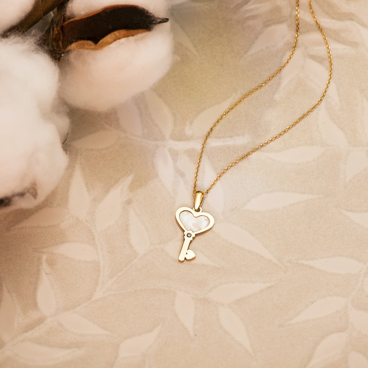 18K COLGANTE AMULETO ORO AMARILLO LLAVE DE NACAR CON CORAZON Y CIRCONITA 18X11 MM