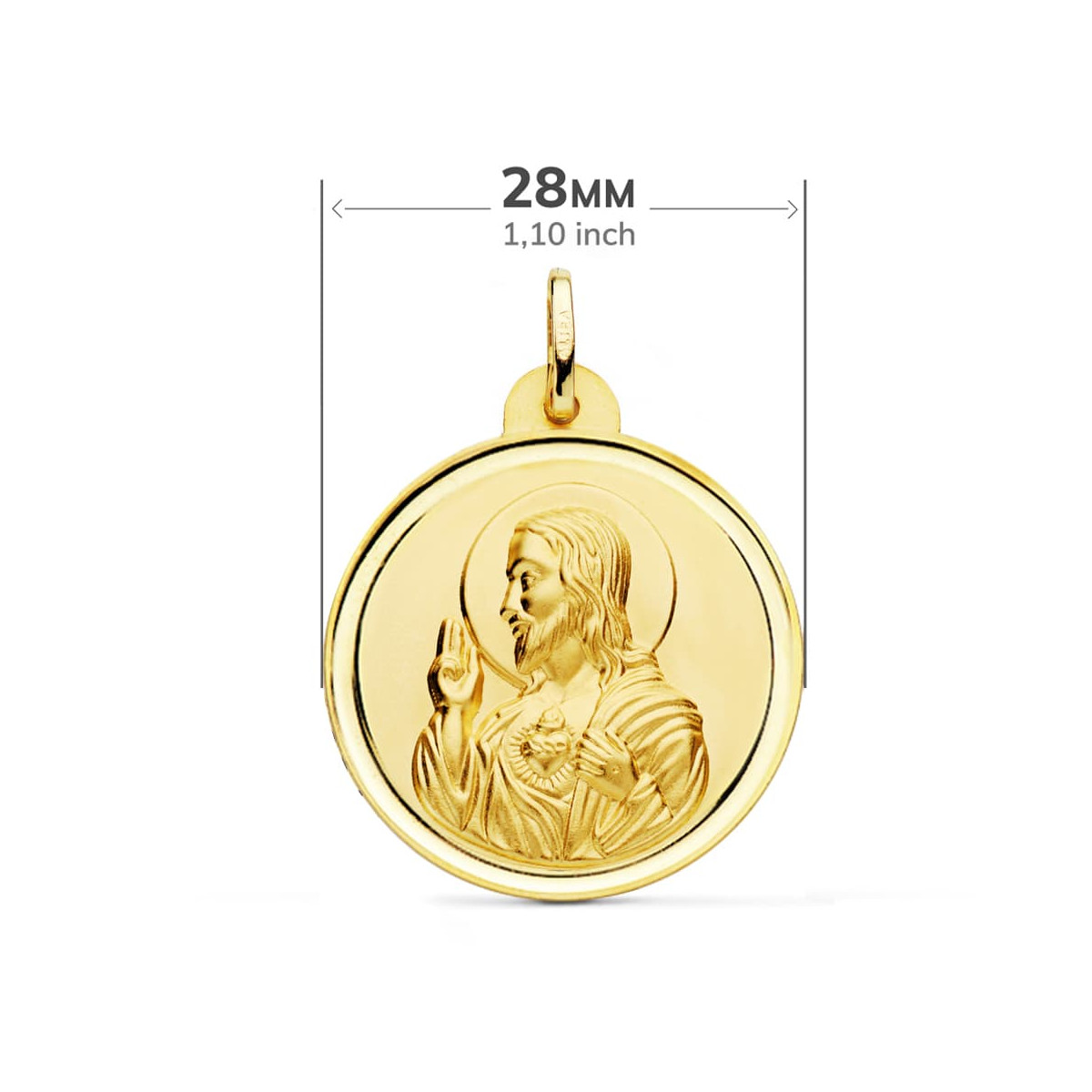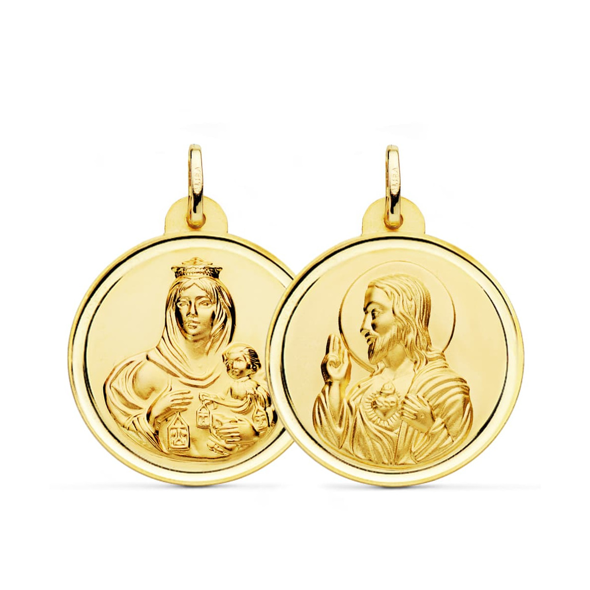 18K ESCAPULARIO ORO AMARILLO BISEL ORO AMARILLO VIRGEN CARMEN Y CORAZON DE JESUS 28 MM