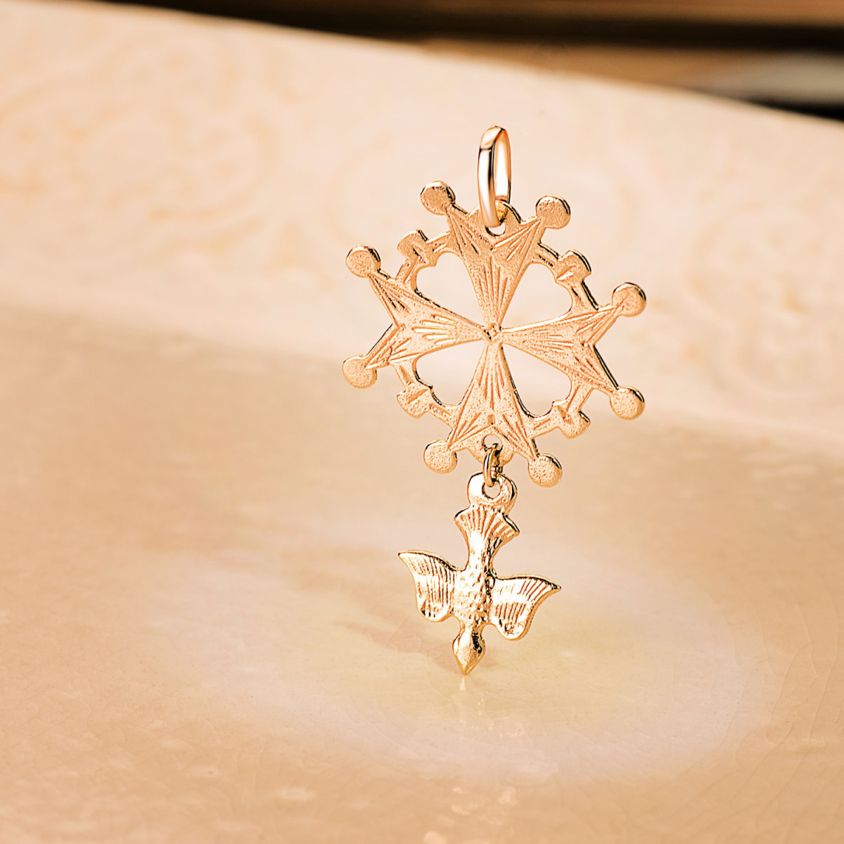18K CRUZ DE HUGUENOTTE ORO AMARILLO CON PALOMA. 40 X 25 MM