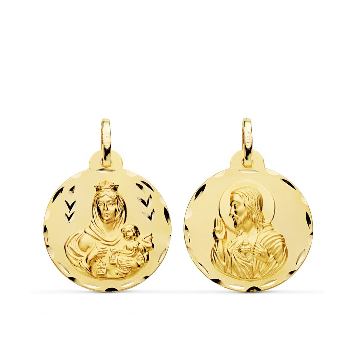 18K ESCAPULARIO ORO AMARILLO TALLADO VIRGEN DEL CARMEN Y CORAZON DE JESUS 22 MM