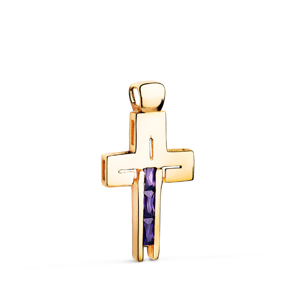 18K CRUZ ORO AMARILLO PIEDRAS BAGUETTE CIRCONITAS COLOR AMATISTA. 27 X 14MM