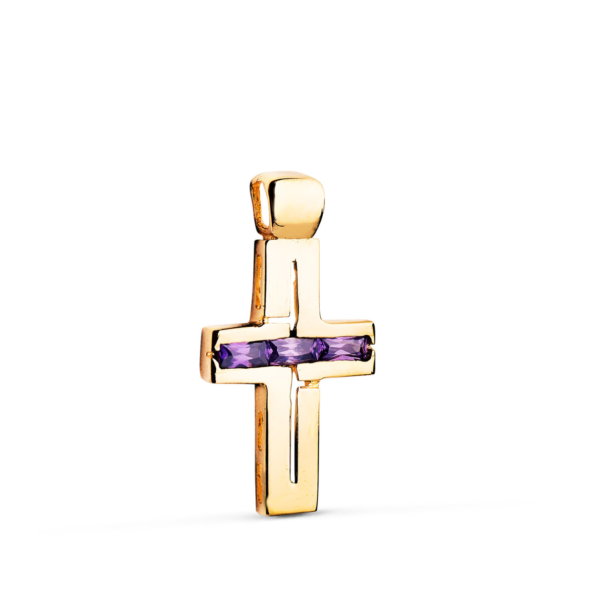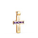 18K CRUZ ORO AMARILLO PIEDRAS BAGUETTE CIRCONITAS COLOR AMATISTA. 25 X 13 MM
