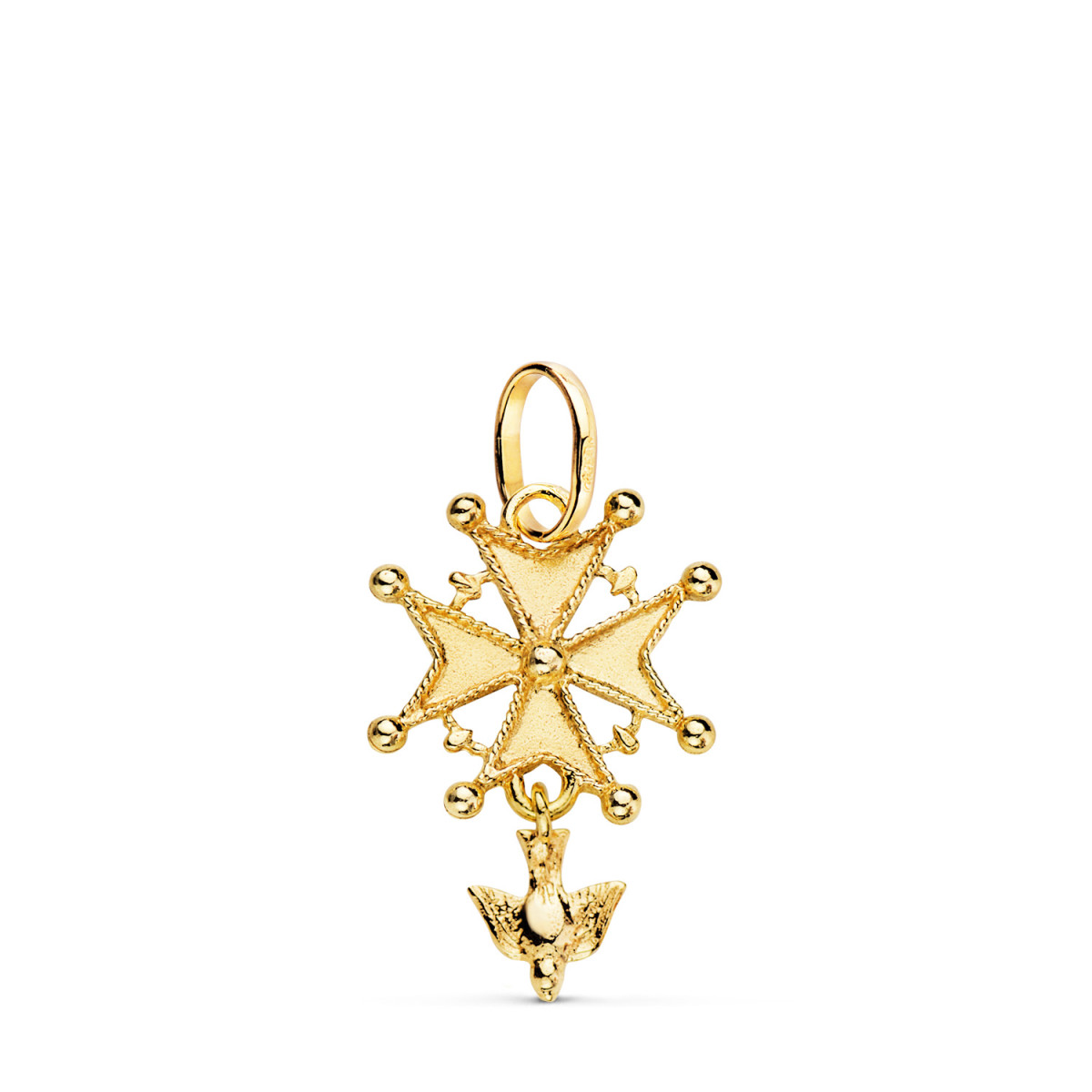 18K CRUZ DE HUGUENOTTE ORO AMARILLO CON PALOMA. 23 X 15 MM