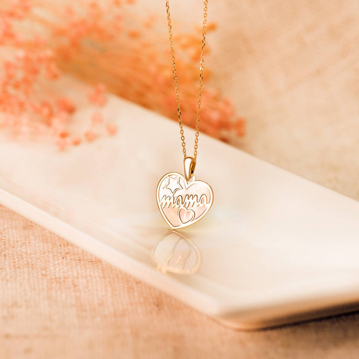 18K COLGANTE CORAZON ORO AMARILLO CON NACAR MAMA Y DIBUJO DE ESTRELLA Y CORAZON 16X14MM
