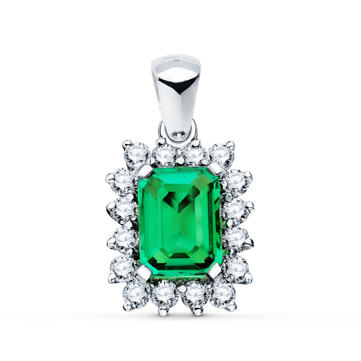 18K COLGANTE ORO BLANCO ESMERALDA RECRISTALIZADA 8X6 MM 1,50 QT. 16 DIAMANTES LABORATORIO 0,56 QTS. VS2-G. 13X11MM