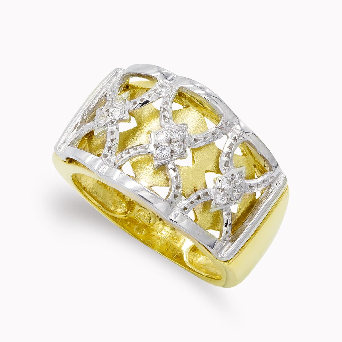 18K SORTIJA ORO BICOLOR CALADA CON CIRCONITAS. ANCHO: 13 MM