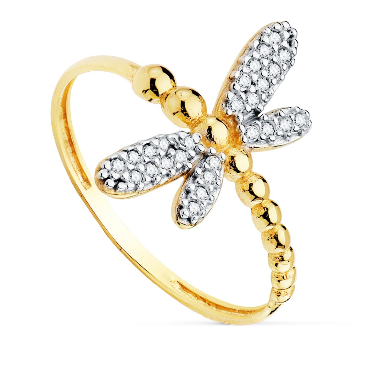 18K SORTIJA ORO BICOLOR CON LILIBELULA CUERPO DE BOLITAS Y ALAS DE CIRCONITAS. ANCHO: 17 MM