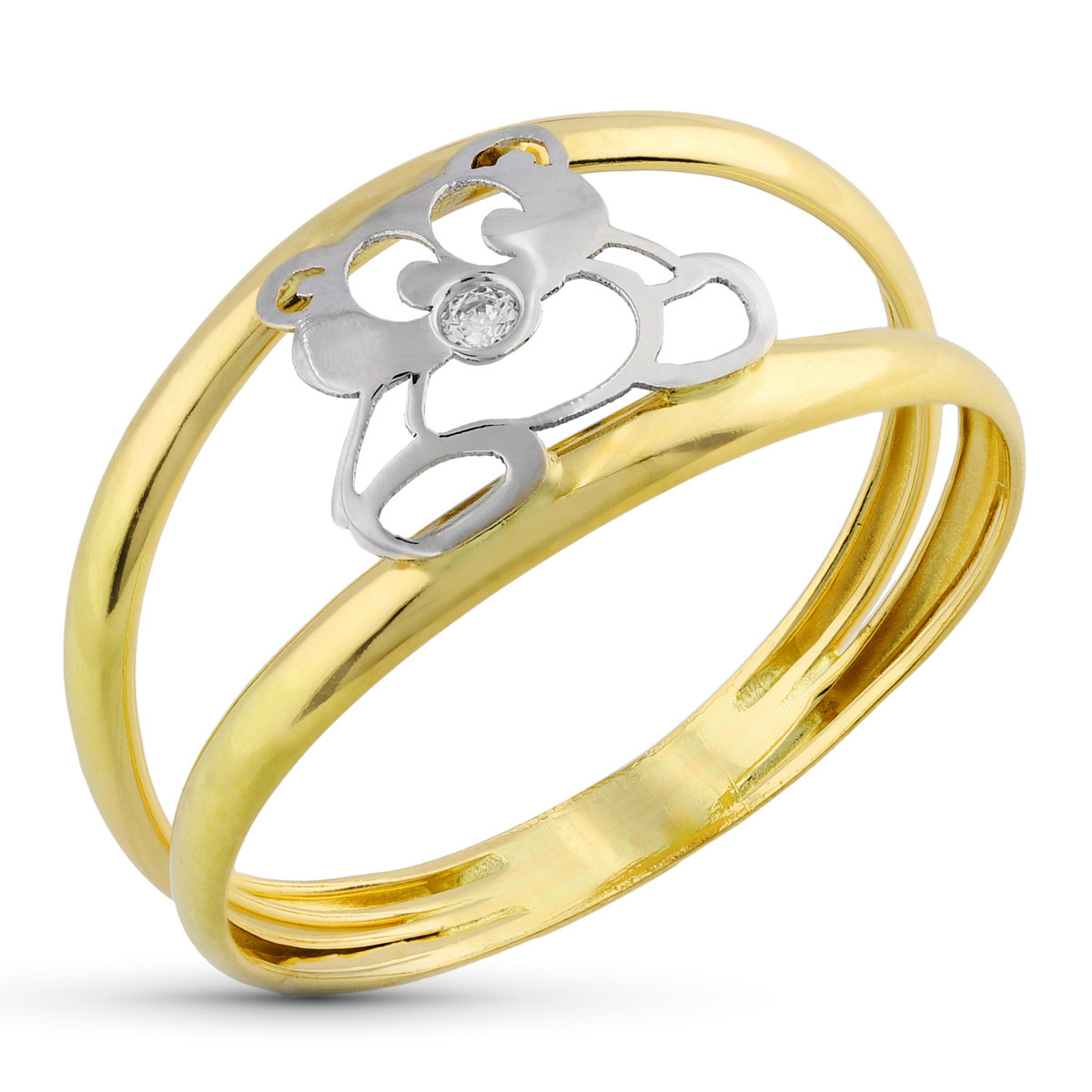 18K SORTIJA ORO BICOLOR DOBLE CUERPO CON GATO CALADO Y CIRCONITA. ANCHO: 9 MM