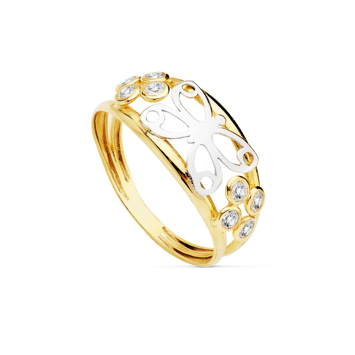 18K SORTIJA ORO BICOLOR DOBLE CUERPO MARIPOSA CALADA Y CIRCONITAS. ANCHO: 8,5 MM