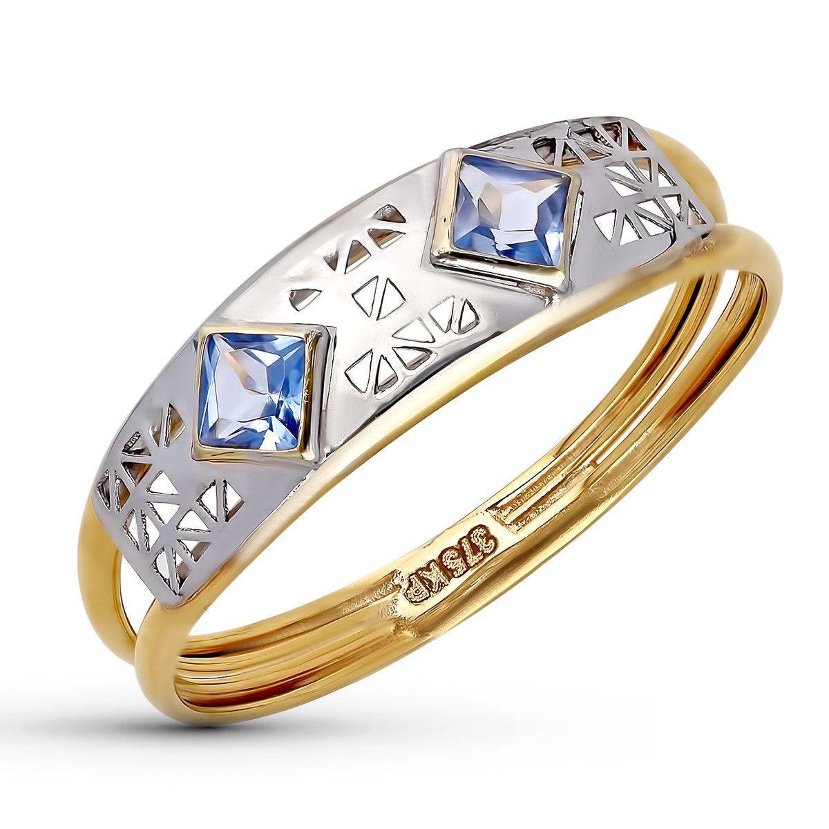 9K SORTIJA ORO BICOLOR DOS CUERPOS CON CALADO Y CIRCONITA AGUA MARINA. ANCHO: 5.5 MM