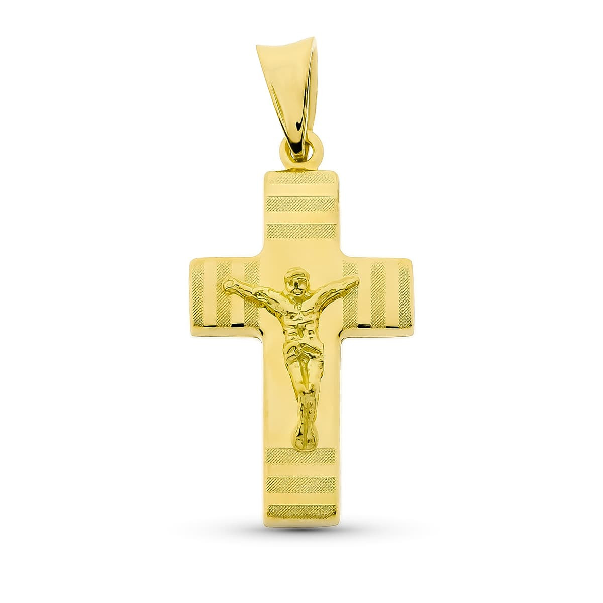 18K CRUZ ORO AMARILLO HUECA CON CRISTO MATE Y BRILLO 27X15 MM