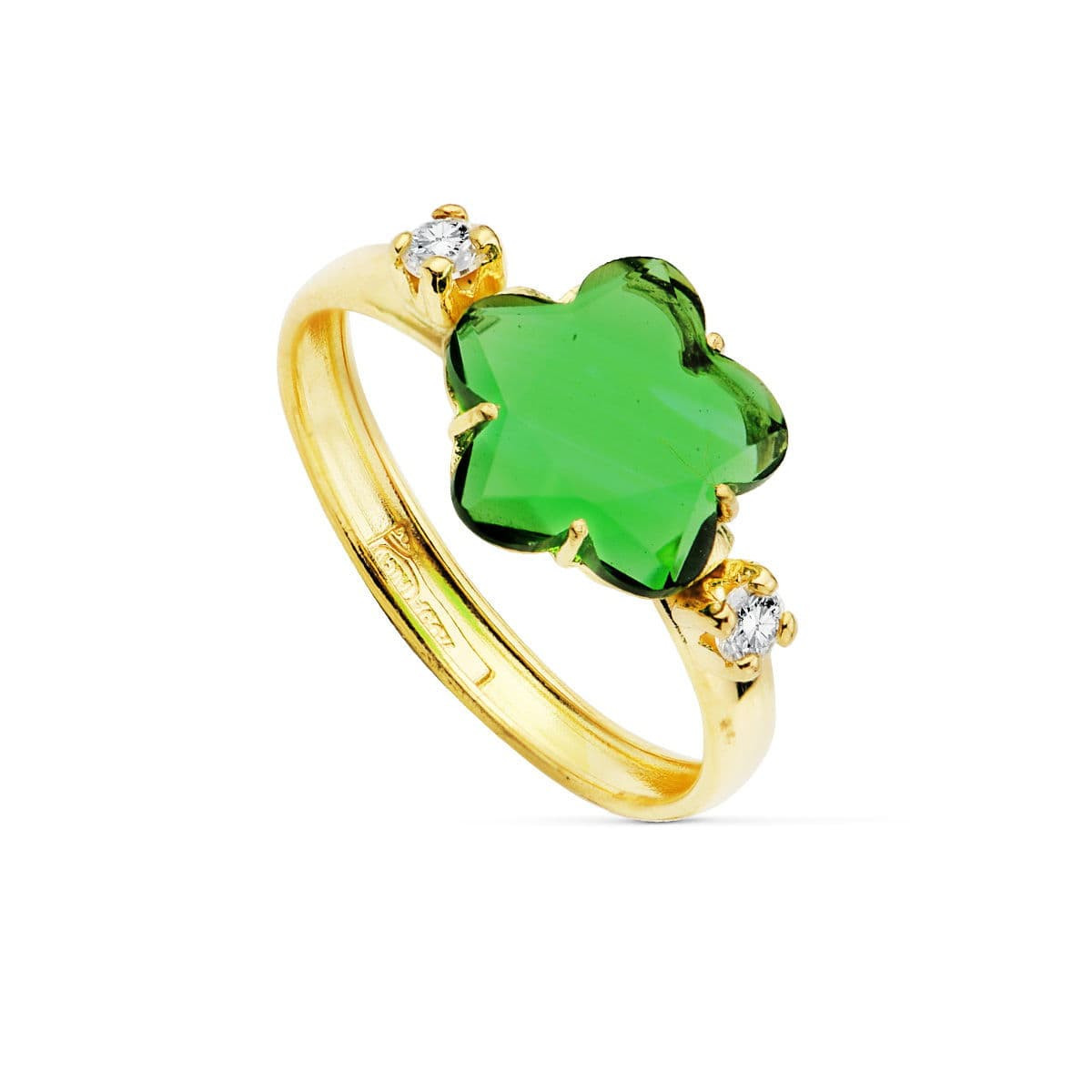 18K SORTIJA ORO AMARILLO CON CIRCONITA VERDE FORMA FLOR 10X10 MM.