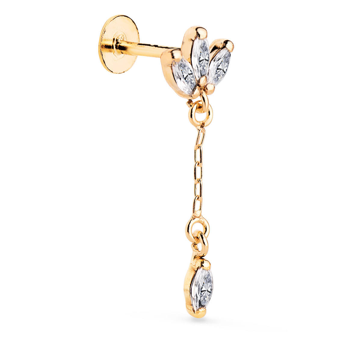 18K PIERCING DE OREJA ORO AMARILLO CON 3 CIRCONITAS Y CADENA. GRUESO BARRA 1.20 MM. MEDIDA: 22 X 7 MM. CIERRE TUERCA