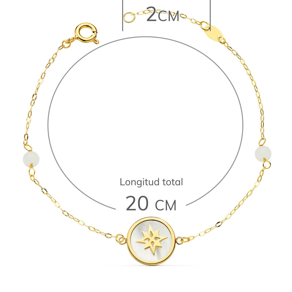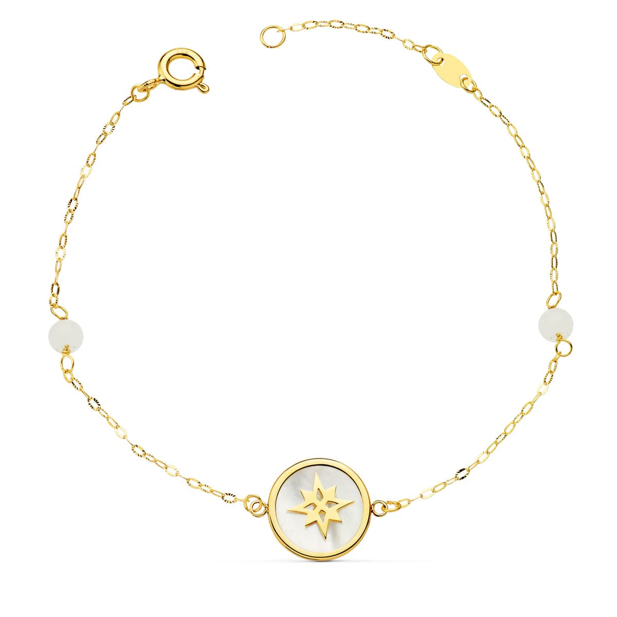 18K PULSERA NACAR Y AMULETO ROSA DE LOS VIENTOS 12 MM Y BOLAS JADE 4 MM CADENA 15 2 CM