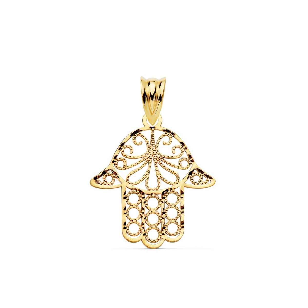 9K COLGANTE ORO AMARILLO MANO DE FATIMA TALLADA. MEDIDA: 20 X 18 MM
