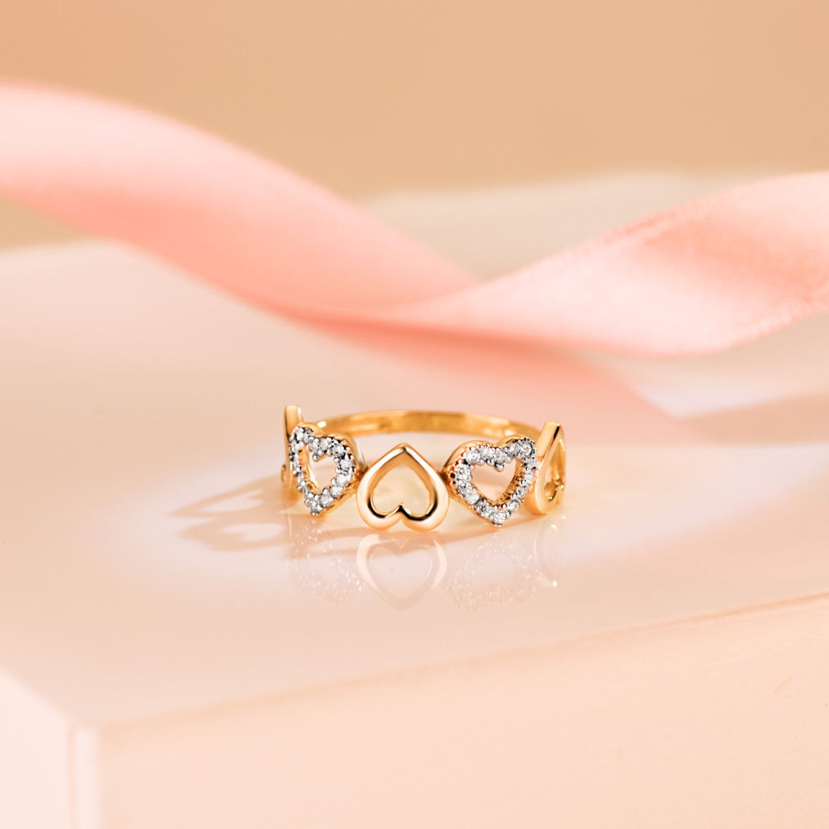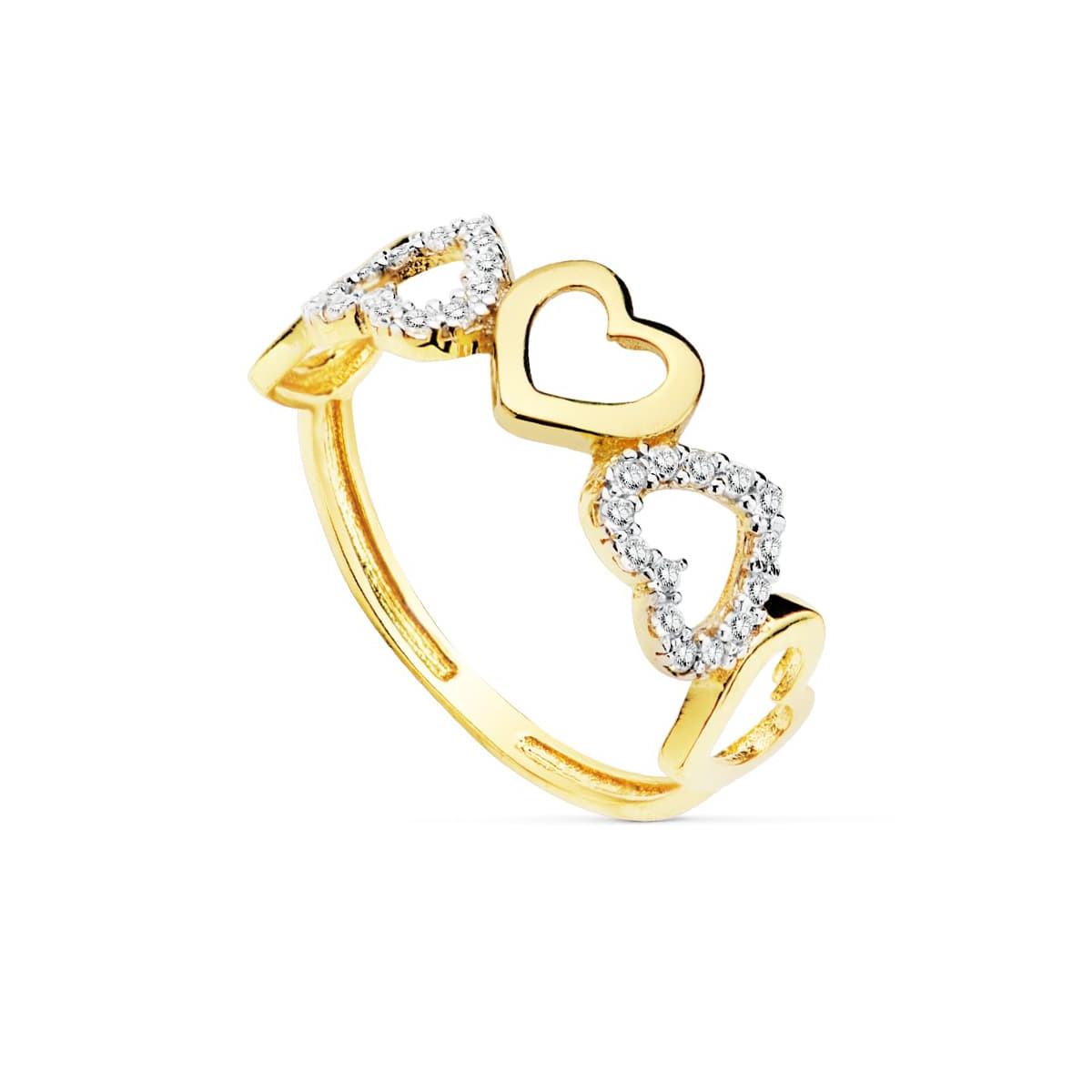 9K SORTIJA ORO BICOLOR CINCO CORAZONES LISOS Y CON CIRCONITAS. ANCHO: 7 MM