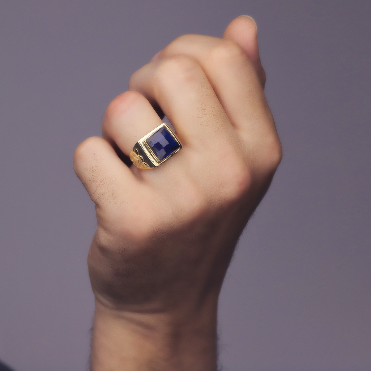 18K SELLO CUADRADO ORO AMARILLO MACIZO CON PIEDRA SPINEL ZAFIRO TALLA DAMERO 12X12 MM