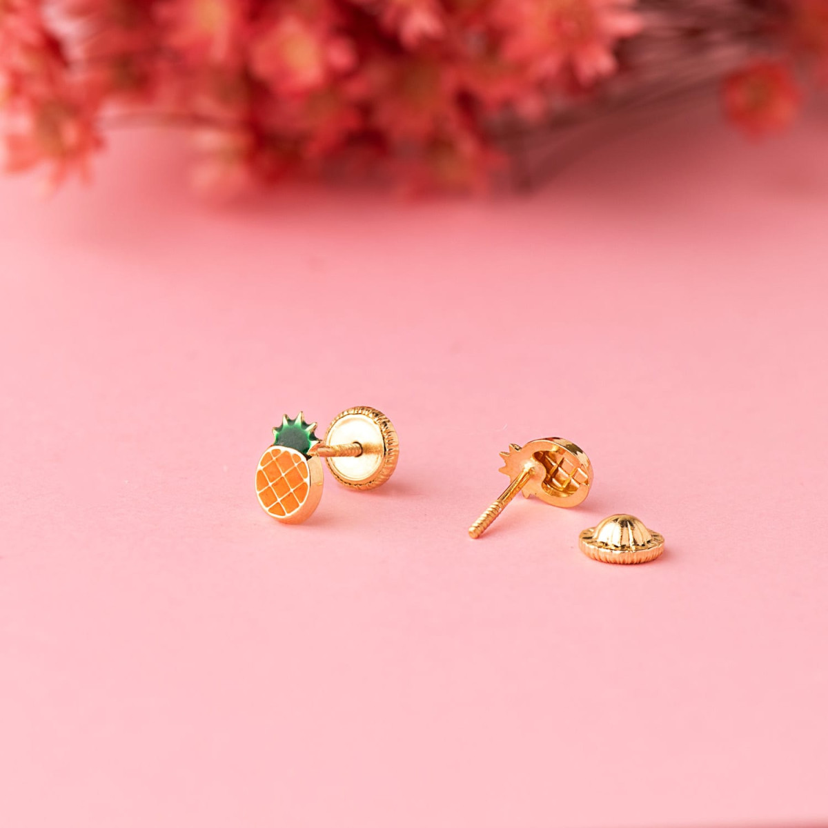 18K PENDIENTES ORO AMARILLO PIÑA ESMALTE NARANJA 6,5 X 4 MM. CIERRE TUERCA