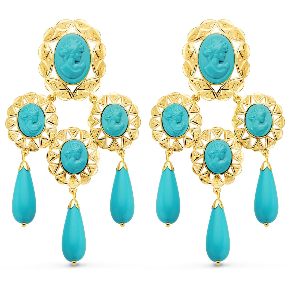 18K PENDIENTES CUBANAS ORO AMARILLO MANTILLA CAMAFEO Y TURQUESAS. 70X38 MM CATALAN