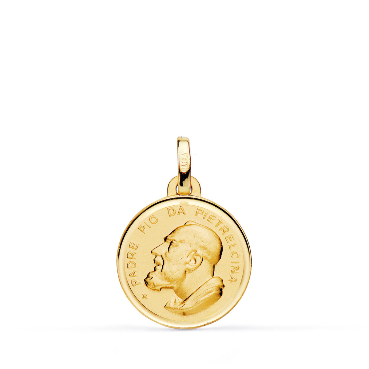 18K MEDALLA ORO AMARILLO PADRE PIO CON BISEL Y MATIZADA. MEDIDA: 16 MM