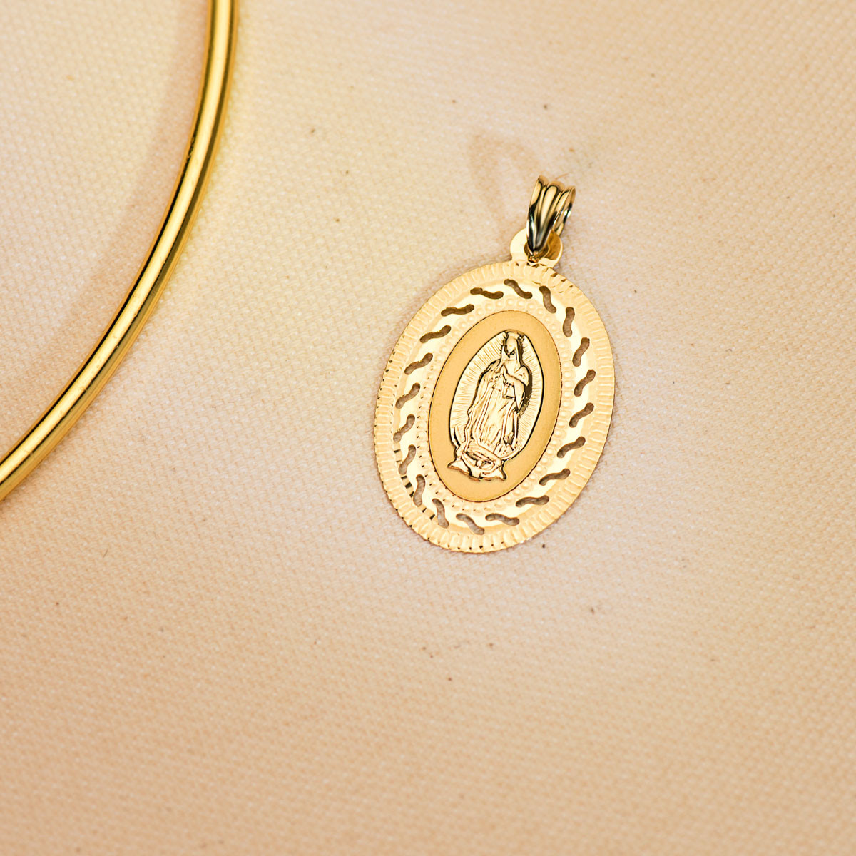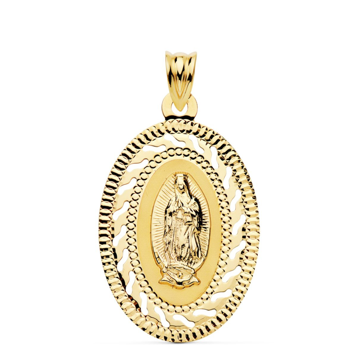 18K MEDALLA ORO AMARILLO VIRGEN GUADALUPE CERCO CALADO Y TALLADO. 34 X 22 MM