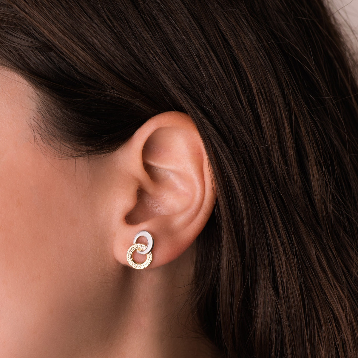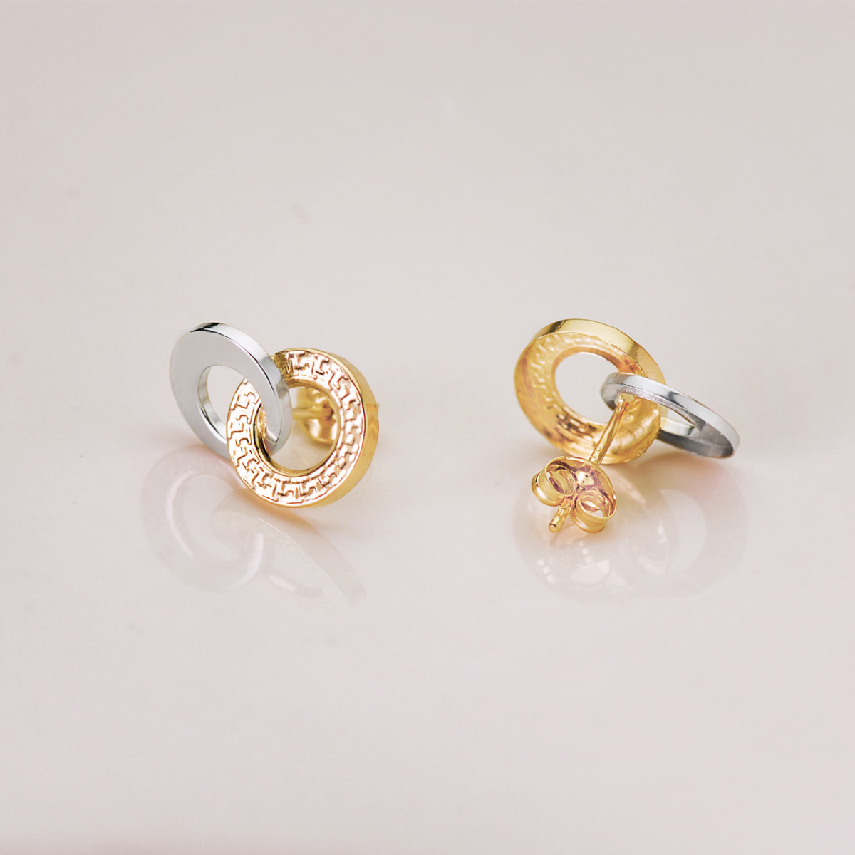 18K PENDIENTES ORO BICOLOR DOBLE ARO LISO Y GRECA 13 X 9 MM. CIERRE PRESION