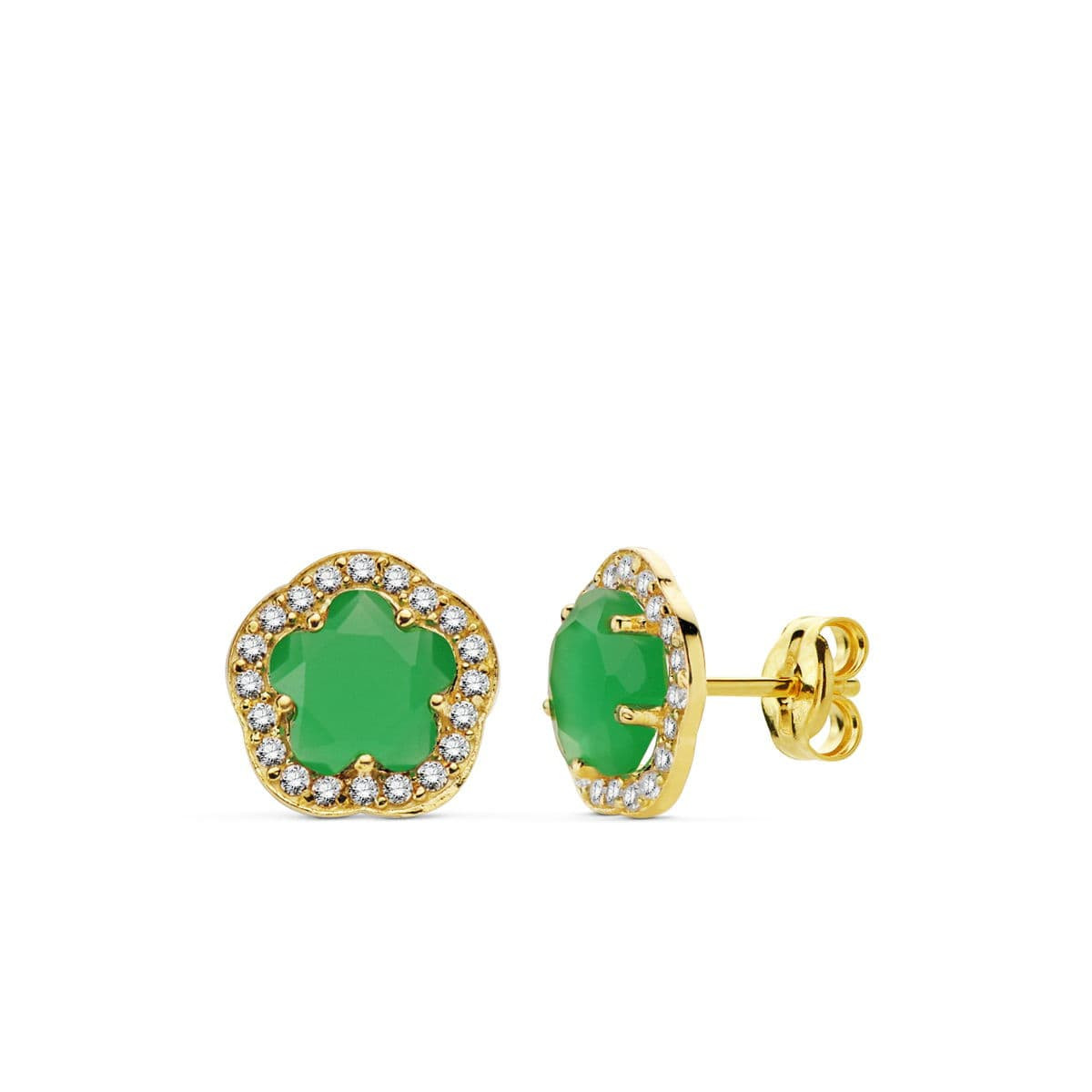 9K PENDIENTES ORO AMARILLO ESTRELLA 9 MM PIEDRA COLOR VERDE CIERRE PRESION