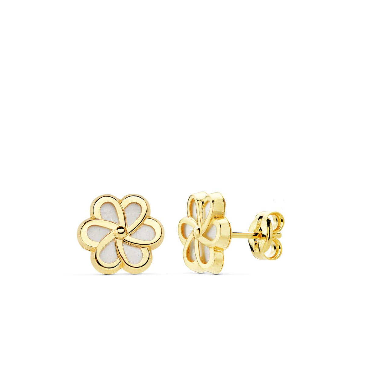 18K PENDIENTES ORO AMARILLO FLOR NACAR 8X8 MM CIERRE PRESION