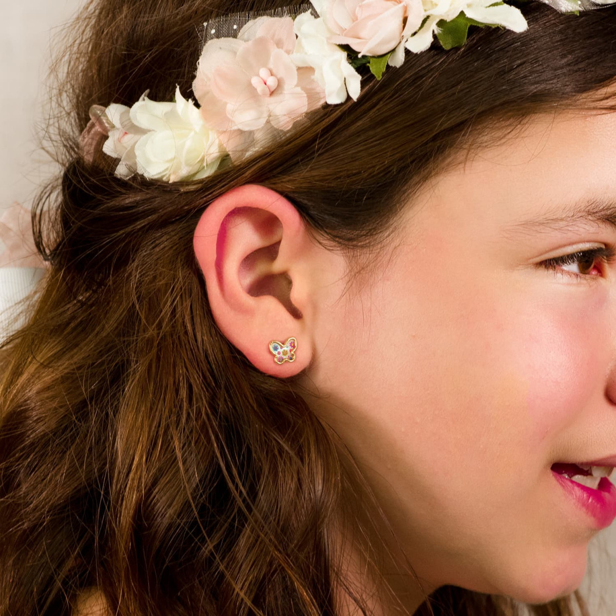 18K PENDIENTES ORO AMARILLO MARIPOSAS NACAR COLORES. 9X7 MM CIERRE PRESION