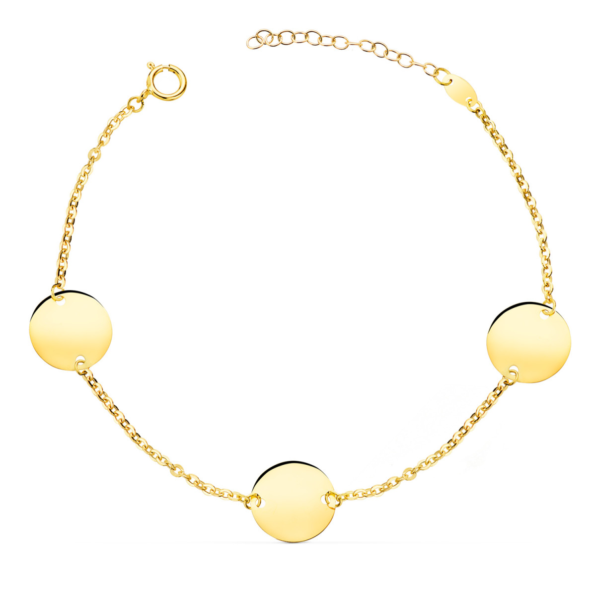 18K PULSERA ORO AMARILLO 3 DISCOS EN BRILLO REDONDOS DE 12 MM. LARGO: 18 3 CM